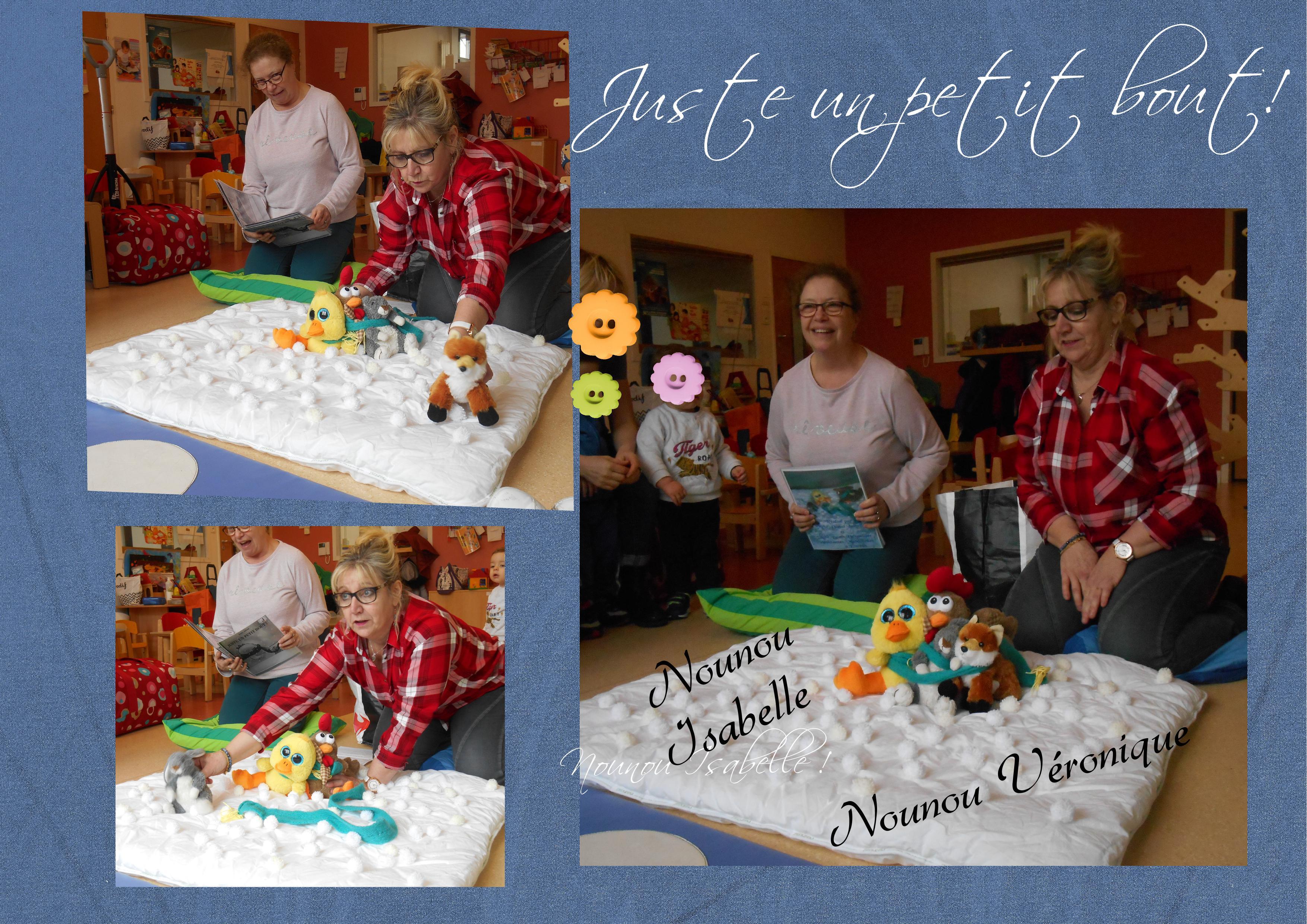 Dans le cadre de nos ateliers du jeudi matin à la médiathèque. Notre animatrice nous faisait la lecture d'un livre intitulé: JUSTE UN PETIT BOUT. Isabelle et moi avons donc crée un raconte tapis, toutes deux sur Evreux, nous avons acheté les animaux et ainsi qu'une couette blanche ou nous avons cousu des pompons en laine et une grande écharpe. Notre tapis achevé.